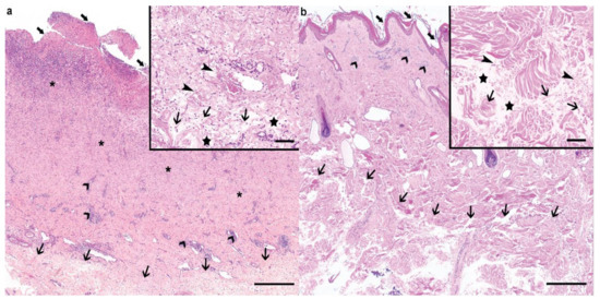 Histologically, the epidermis at the level of the cervical lesion of the calf displayed a severe, diffuse ulceration, with underlying proliferation of mature granulation tissue associated with neovascularisation, abundant neutrophilic superficial infiltrates, and adnexal structure loss (Figure 3a). The epidermis at the border of the ulcerated area displayed abundant serocellular crusts associated with serum lake formation, spongiosis, and ballooning degeneration of the stratum granulosum. Multifocal perivascular, moderate lymphoplasmacytic infiltrates could be observed in the dermis underlying the ulcerated area. The deeper dermis displayed interlacing, wavy, short, thin collagen bundles, which were surrounded by a moderate interstitial edema, as well as moderate to severe acute hemorrhages (Figure 3a).