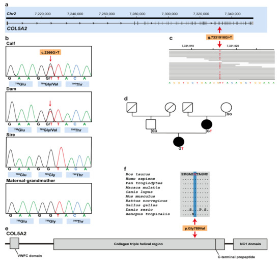 Filtering of WGS for private variants present in the affected calf and absent in the 496 available control genomes identified a single protein-changing variant in COL5A2 with a predicted moderate impact on the encoded protein. The heterozygous variant in COL5A2 exon 35 on chromosome 2 (chr2:g.7331916G>T) was confirmed using IGV software (Figure 3a,c). The detected COL5A2 variant (XM_024979774.1: c.2366G>T) alters the encoded amino acid of COL5A2 residue 789 of the collagen triple-helical region (XP_024835542.1: p.Gly789Val) included in the collagen alpha-2(V) chain (Figure 4e). Furthermore, the glycine to valine substitution affects an evolutionary conserved residue (Figure 4f) and was predicted to be deleterious (PROVEAN score: −8.294; MutPred2 score: 0.917; PredictSNP1 score: 0.869). To confirm and evaluate the presence of the COL5A2 variant, the affected genomic region was amplified by PCR and Sanger sequenced in the calf, its dam, its maternal-grandmother, and its sire (Figure 4b). Analyzing the sequencing data, we observed that the calf and its dam were heterozygous for the detected COL5A2 variant, whereas the sire and the maternal-grandmother were homozygous for the wild type allele (Figure 4b,d). Unfortunatly, no samples from other closely related animals such as the maternal-grandfather were available.