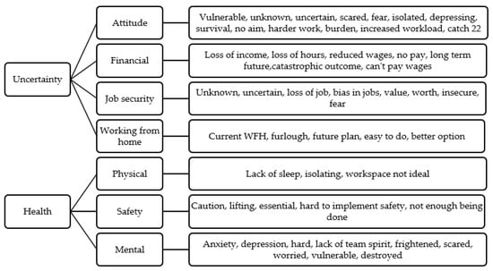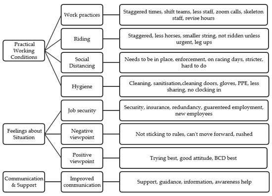 A total of 259 people commented on use of support services. Whilst 70.66% of participants reported having not accessed any racing-specific support services online or via phone (n = 183), of those who had, the British Horseracing Authority (BHA), Racing Welfare and the National Trainers Federation (NTF) were reported as most used (10.42%, 4.63%, 4.63%, respectively). When asked about financial support services, 81.82% of participants reported not accessing any support services for financial purposes. The most common reported financial support was the self-employed government financial scheme (8.66%). Participants were asked about any further comment on how COVID-19 had impacted their working conditions. Whilst 85 responses reported no further comments, remaining data were analysed, resulting in the following themes (Figure 2):