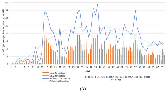 The first louse flies to be identified as L. fortisetosa were collected on 7 May 2019 and 2 June 2020. During field tests, a total of 1995 individuals (M = 14.25; ME = 14.5; SD = 10.96; SE = 0.93; V = 76.87; Min = 0; Max = 39.0; K = −0.94; Ske = 0.23) were sampled, including 1028 (51.53%) females and 967 (48.47%) males. Differences in sex distribution as a function of time were not statistically significant (for the model: df = 1; MS = 225.04; F = 5.38; p-value = 0.02; female vs. male: df = 1; MS= 2.61; F = 0.78; p-value = 0.38; male vs. female vs. time: df = 1; MS = 0.047; F = 0.014; p-value = 0.91). The first peaks denoting high levels of ked activity were observed on day 16 in 2019 and day 35 in 2020. The number of louse flies collected on each sampling day is presented in Figure 1.
