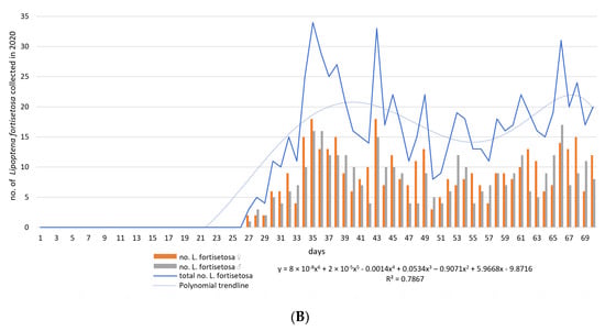 The number of Lipoptena fortisetosa specimens collected on each sampling day between 6 May and 15 July in 2019 (A) and 2020 (B). Legend: y—logarithmic function; R2—coefficient of determination.
