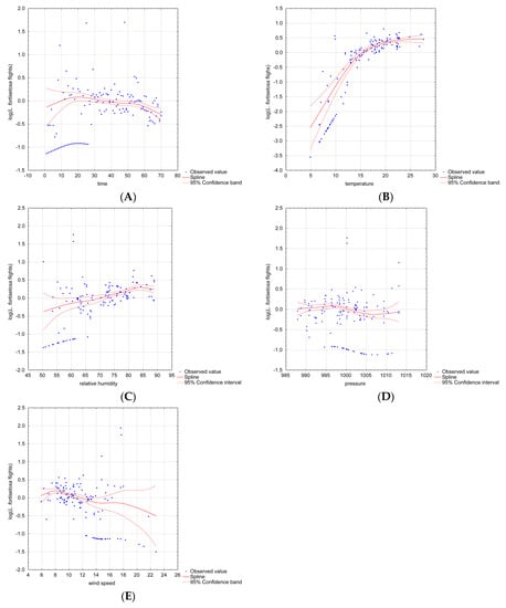 Nonlinear effects of different continuous covariates on Lipoptena fortisetosa abundance. Legend: the plots present the results of two-dimensional cubic spline interpolation with the observed predictor values plotted against the partial residuals; (A) time, (B) temperature, (C) relative humidity, (D) air pressure* and (E) wind speed; *—not significant.
