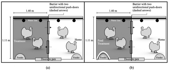 Pen layout with pen divider creating two different compartments (home and treatment) accessible through unidirectional doors. The treatment and home compartments alternated locations to avoid side bias. Each compartment had ad libitum feed and water access. (a) Pen setup to test substrate treatments (soiled pine and spruce wood shavings (SP), soiled pine and spruce shavings treated with an ammonia reductant (TSP), fresh pine and spruce wood shavings (FP), no substrate (NS)). (b) Pen setup for the feed treatment, which involved blocking access to feed in the home compartment.
