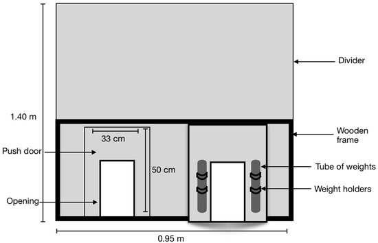 Divider layout with push doors viewed from turkey eye level. Dividers were built high (1.4 m) to ensure the birds would not perch or attempt to get over them. We equipped each divider with two push doors that mounted just below the wooden frame. Furthermore, we fixed each unidirectional push door with metal “weight holders” that held tubes of modifiable weight (modified by adding or removing lead weights). The doors were made of transparent plastic.