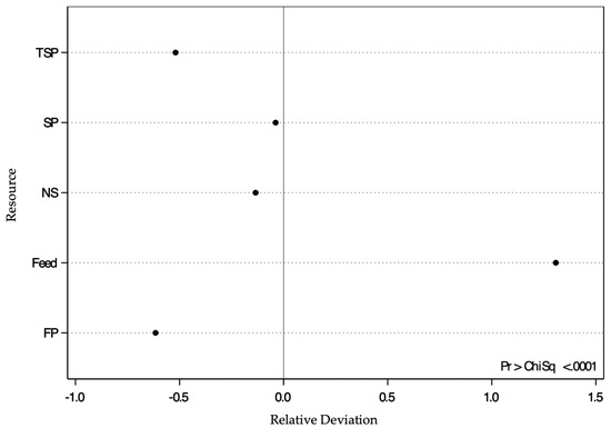 The relative deviation from the expected proportion of turkeys (n = 24; expected proportion indicated by the vertical line at 0.0) that pushed the maximum door weight (40%) to access each resource (feed, soiled pine and spruce wood shavings (SP), fresh pine and spruce wood shavings (FP), ammonia reductant-treated soiled pine and spruce wood shavings (TSP) and no substrate (NS)). If all the dots were on the line at 0.0, this would indicate that an equal proportion of birds pushed a maximum door weight of 40% to access all resources, implying that they ascribed equal value to all resources. A positive deviation indicates that a higher proportion of turkeys than expected pushed 40%, while a negative deviation indicates that a lower proportion of turkeys pushed the 40% than expected.