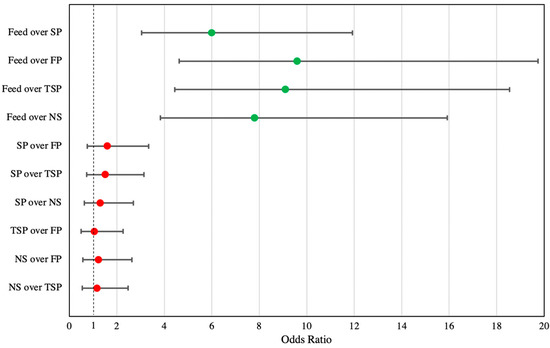 The odds of the turkeys entering the treatment compartment in the presence of one resource (feed, soiled pine and spruce wood shavings (SP), fresh pine and spruce wood shavings (FP), ammonia reductant-treated soiled pine and spruce wood shavings (TSP) and no substrate (NS)) over another. Odds ratios are represented by a solid dot and flanked by a 95% CI. Significant odds ratio comparisons (green dots) have a CI that does not overlap 1, while non-significant comparisons (red dots) have a CI that overlaps 1.