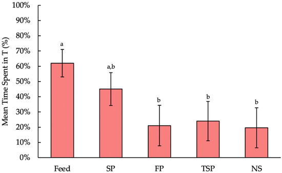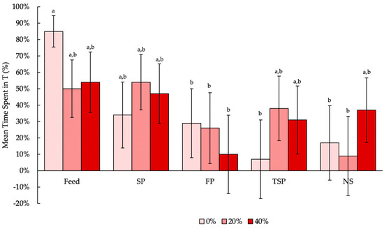 Effect of resource (feed, soiled pine and spruce wood shavings (SP), fresh pine and spruce wood shavings (FP), ammonia reductant-treated soiled pine and spruce wood shavings (TSP), no substrate (NS)) on the mean time spent (%; backtransformed LS means ± SEM) in the treatment compartment (T) for 14 h per day. Bars with different letters display significant differences (p < 0.05).