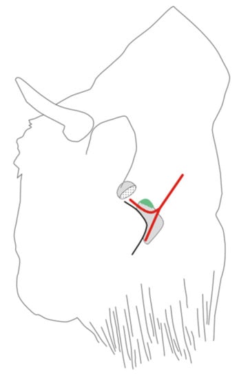 The location of the biopsy needle insertion in the European bison, performed to collect a fragment of the retropharyngeal lateral lymph node. Legend: hatched organs: above the projection of the parotid gland, below the projection of the mandibular gland. The projection of the lateral retropharyngeal lymph node is given in green. Red lines: upper—projection of the maxillary vein, lower—projection of the lingual–facial vein. The maxillary vein and facial–linguistic vein converge into the external jugular vein.