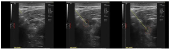 Before performing the punctures, hair was shaved and skin disinfected with alcohol. A Quick-Core Biopsy Set (Cook Medical, Bloomington, IN, USA) biopsy needle with a 15 cm coaxial kit was used to collect the sample. The head of the ultrasound was applied at 1/3 of the length of the mandible branch, below the wing of the apical vertebra, in the direction of the head. The course of the puncture was monitored by ultrasound by inserting the coaxial set, which was the guide for the biopsy needle (Figure 2). The puncture was performed at a depth of 5–7 cm. The needle was directed toward the head under the mandibular branch of the lingual –facial vein. The tip was gently inserted into the lymph node after overcoming the resistance of its capsule. In order to collect as much material as possible, the needle was rotated around its long axis before releasing the plunger. The piston was then released and the needle removed. The collected material was suspended in 1 mL of sterile physiological solution (Polfa Lublin, Poland) and transported in sterile tubes to the laboratory at 4 °C.