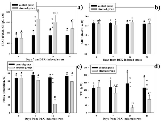 Antioxidant capacity assessed by different methods in healthy and the dexamethasone (DEX)-stressed hens: (a): ferric reducing ability (FRAP) assay; (b): ABTS decolorization assay; (c): free radical scavenging activity (FRSA); and (d): total thiol levels (TTL). Values are expressed as means ± standard deviation. Means with asterisks at the same sampling time are statistically different (*, p < 0.05; ***, p < 0.001). Means of the same group with different letters at different sampling times are statistically different (lowercase letters, p < 0.01; capital letters, p < 0.001).