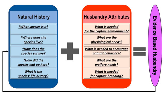 Model of the relationship of Bartholomew’s natural history questions and life history information along with questions specific to husbandry attributes when answered lead to evidence based husbandry, which in turn can lead to potential novel natural history observations (black arrow). * = Bartholomew’s questions.