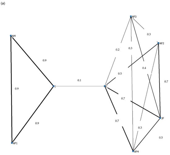 The strongest index of association scores in sub-group 1 were observed between ‘JF’ and ‘C’ (0.7 and 0.8 summer and winter respectively), ‘AF4′ and ‘C’ (0.7 and 0.6 summer and winter respectively) and ‘AF2′ and ‘JF’ (0.7 and 0.6 summer and winter respectively). Throughout the summer period (Figure 6a), Sub group 2 had high index of association scores between all dyads (0.9). Throughout the winter period, ‘I’ chose to associate with ‘AF2′, ‘AF3′, ‘AF4′ and ‘JF’. ‘AM’ chose to associate less frequently with members of Sub group 1 leading to the removal of this individual from the core sociogram (Figure 6b).