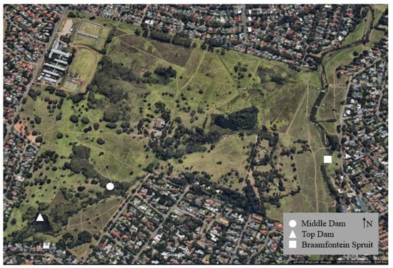 Water and sediment samples were collected from three sites within Delta Park: Middle Dam (−26.127914, 28.006980), Top Dam (−26.129288, 28.003892) and the Braamfontein Spruit (−26.126860, 28.016090) (Figure 1). At each site, water was collected in two 500 mL bottles that had been sterilized through autoclaving (KT—2346A, ALP Co., Ltd. Tokyo, Japan) for 40 min at 115 °C under 1 atmosphere pressure. At the collection site, the lids were opened approximately 15 cm below the water surface, the bottles were filled with water, and the lids were closed while still underwater. For sediment collection, soil was collected into three 50 mL plastic tubes from various sites in the dams and river, approximately 1 m from the bank. All samples were immediately transferred to the Centre for Ecological Genomics and Wildlife Conservation at the University of Johannesburg. Water samples were placed in a refrigerator at 4 °C and sediment samples were preserved in a freezer at −20 °C. Environmental samples were processed within 24 h of collection.