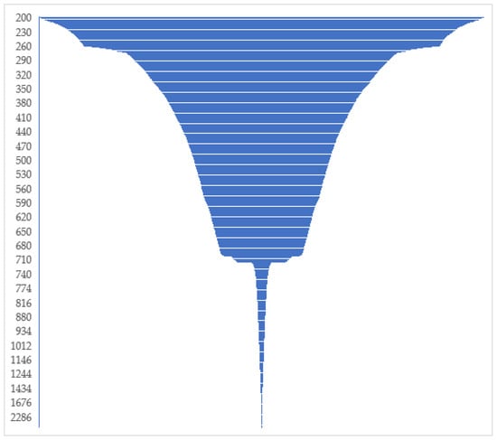 A funnel graph showing the cumulative length distribution of the unfiltered assembled sequences. The Y axis represents the cumulative length of the scaffolds in base pair. The bottleneck in the figure reflects ~710 bp, the theoretical length of the target sequences. Less than 5% of sequences had a length exceeding 713 bp, and these were removed from the dataset.
