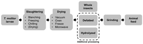 The International Platform of Insects for Food and Feed (IPIFF) [] reported that insects are typically processed by slaughtering (heating or freezing) and post-slaughtering (drying and grinding) procedures for animal feed (Figure 1). These procedures are important not only for ensuring safety, but also for maintaining the nutrient composition. The slaughtering process includes blanching, freezing, chilling, and drying. This allows the long-term storage and transport of T. molitor larvae. Many researchers have attempted to find the optimal method for optimizing both the safety and nutritional value. Vandeweyer et al. [] suggested blanching before chilling or drying because blanching enables vegetative cells to be killed and prevents microbial growth during storage. After slaughtering, drying is important because of the high moisture content of the T. molitor larvae (approximately 68%). This high moisture content might cause enzymatic or non-enzymatic degradation and microbiological spoilage []. Therefore, a 4 to 5% moisture content is recommended to avoid possible problems []. The major methods employed for drying are oven drying [], vacuum drying [], freeze-drying [,], and microwave drying []. Kröncke et al. [] reported that different drying types did not result in hugely different nutritional values for the T. molitor larvae. Moreover, all of those drying types resulted in low water activity in T. molitor larvae and this content does not allow microbiological growth []. In the study of Kröncke et al. [], on the other hand, oven drying had the shortest processing time and lowest energy consumption. Therefore, blanching and oven drying might be the most efficient way to process T. molitor larvae. After drying, the specimens are usually finely ground to the same particle size as other feed ingredients.