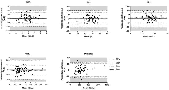 Bland–Altman plots of the RBC, hematocrit, hemoglobin, WBC, and platelet results were constructed from the venous–arterial pairs (Figure 1). Results for bias, LOA, and TEa for each hematological parameter defined by the ASVCP guidelines are summarized in Table 3. The comparison of the LOA for each parameter with its TEa showed that the LOAs of all hematological parameters were within the proposed limits (Figure 1).
