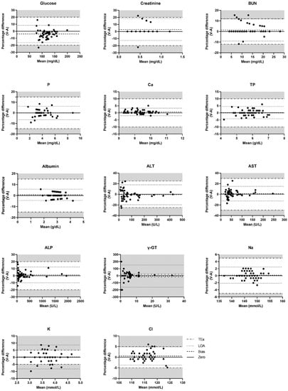 Bland–Altman plots of the glucose, creatinine, BUN, phosphate, calcium, TP, albumin, ALT, AST, ALP, γ-GT, Na, K, and Cl results were constructed from the venous–arterial pairs (Figure 2). The results for bias, LOA, and TEa for each biochemical parameter as defined by the ASVCP guidelines are summarized in Table 3. The comparison of the LOA for each parameter with its TEa showed that the LOAs of γ-GT and K were not within the proposed limits, while the LOAs of the other biochemical parameters were within their TEa (Figure 2).