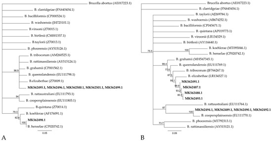 Phylogenetic trees based on the gltA (340 bp) (A) and ITS (512 bp) (B) partial sequences of Bartonella identified in the present study (GenBank accession number in bold) and from GenBank (description and GenBank accession number in bracket). The phylogenetic tree was constructed selecting Tamura-Nei as genetic distance and Neighbor-Joining as tree building method. Bootstrap calculation was carried out with 1000 resamplings with support threshold ≥ 70%. Phylogenetic trees were built using Geneious Prime software version 2019.0.4.