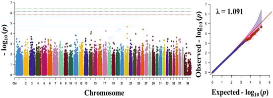 where y is a phenotype, x and z are design matrices, β is a vector of fixed effects, u is an additive genetic effect for each marker, and e is a vector of residual [30]. A Bonferroni-corrected threshold was applied to correct for multiple testing, and the genome-wide significance threshold was p < 3.74 × 10−7 (~0.05/135,553). Manhattan and quantile-quantile (Q-Q) plots were generated using CMplot package in R [24].