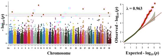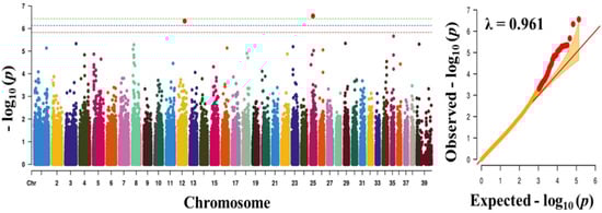 To find significant loci associated with the three traits (obesity, body weight, and blood sugar), we performed GWAS with 133,553 SNPs which passed our filtering criteria. The Q-Q plot of the association study indicated a significant clear deviation for blood sugar (λ value = 0.961) and body weight (λ value = 0.963), but, for obesity, there was no obvious deviation (λ value = 1.091) (Figure 1, Figure 2 and Figure 3). The p-value obtained from the GWAS was plotted as Manhattan plots (Figure 1, Figure 2 and Figure 3). Our result showed that 2 and 7 SNPs were significantly associated to blood sugar and body weight, respectively, at the genome-wide significance level of p < 3.74 × 10−7 (i.e., Bonferroni corrected threshold (0.05/133,553). The candidate SNPs associated with blood sugar were on chromosomes 25 and 12; whereas for body weight they were on chromosome 9, 26, 37, 1, 39, and 7 (Table 4). Moreover, none of the SNPs were found to be significant (p < 3.74 × 10−7) for obesity.