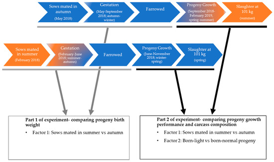 The experiment consisted of two parts. Part 1 compared the birth weight of sows that were mated in summer with those mated in autumn. Part 2 followed a two by two factorial design to study the effects of the mating season of sows and the birth weight class (light vs. normal) of their progeny on growth performance and carcass traits of progeny at a fixed slaughter weight. A flowchart of the experiment is illustrated in Figure 1. The procedures that involved animals in the current study were in accordance with the Australian Code for the Care and Use of Animals for Scientific Purposes (8th edition, 2013), and the protocol (ID:17P074C) was approved by the Animal Ethics Committee of Rivalea Australia Pty Ltd., Corowa, NSW, Australia.