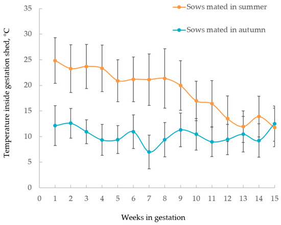 In addition to the hot conditions during early gestation, we also found other factors may potentially contribute to the reduced birth weights of progeny that were born to the sows mated in summer. The effects of these factors on fetal development warrant further investigations in controlled studies. First, the negative energy balance of sows during summer lactation may jeopardise the body conditions of sows at subsequent mating and have carry-over effects on fetal development. We found that sows mated in summer were 20 kg lighter at mating than those mated in autumn, which is likely to be a consequence of negative energy balance during summer lactation [30,31]. Similarly, in our previous lactation studies conducted in summer and autumn, we observed that sows lactating in summer had 15% lower ADFI and 33 kg less body weight at weaning than those lactating in autumn [32,33]. The restricted amount of energy allowance during gestation might have to be distributed towards maternal tissue recovery, thus nutrient allocation to the conceptus could be affected. Interestingly, we found that the sows mated in summer gained more body weight during gestation than those mated in autumn although the gestational nutrient intake was similar, which may be due to the greater body heat loss of the sows mated in autumn and then gestated over the winter season. Second, our experiment showed that the sows mated in summer had a high number of skin injuries in the first weeks post-mating, implying increased social stress during early gestation. Both rodent and human studies reported that maternal stress was associated with reduced fetal weights [34,35], so it is postulated that the increased social stress of sows post-mating in summer may be another factor causing a reduction in piglet birth weights.