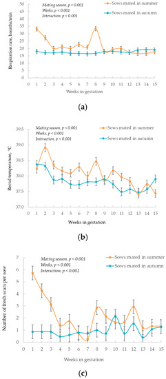 Sows mated in summer showed a higher respiration rate (Figure 3a) and rectal temperature (Figure 3b) during the first eight weeks of gestation compared with those mated in autumn (both mating season and gestation weeks interaction, p < 0.001). The number of fresh scars was significantly greater in the sows mated in summer than in those mated in autumn in the first three weeks of gestation (mating season and gestation weeks interaction, p < 0.001, Figure 3c).