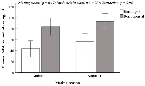 New-born piglets from sows mated in summer and autumn had similar plasma IGF-1 concentrations (Figure 4). The born-light pigs had a markedly lower plasma IGF-1 concentration than born-normal piglets (50.3 vs. 88.6 ng/mL, p < 0.001), regardless of the mating seasons of sows. The interaction between mating season and progeny birth weight class was not significant.