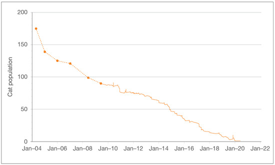 Reduction in Project Bay Cat (PBC) population over 16 years, indicating a starting population of 175 cats with one cat remaining at the end of the study period. Data prior to July 2009 (indicated by filled circles and dashed lines) was obtained from annual reports; later, more detailed data was obtained from feeding station log books.
