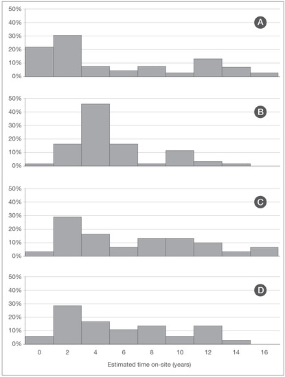 Histograms illustrating the proportion of the most common modes of disposition: adoption, foster care, and relocation ((A), n = 127); disappearance from site ((B), n = 60); death ((C), n = 31); and euthanasia ((D), n = 35).