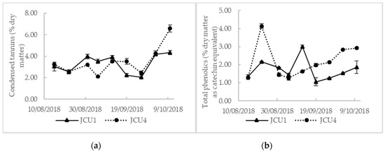 Variation in (a) condensed tannins (% dry matter) and (b) total phenolics (% dry matter as catechin equivalent) throughout the feeding period.