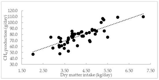 The relationship between dry matter intake (kg /day) and CH4 production (g/day). The relationship can be described as CH4 production (g/day) = 26.11 + 12.39X, where X = dry matter intake (kg/day) R2 = 0.74, p < 0.0001.