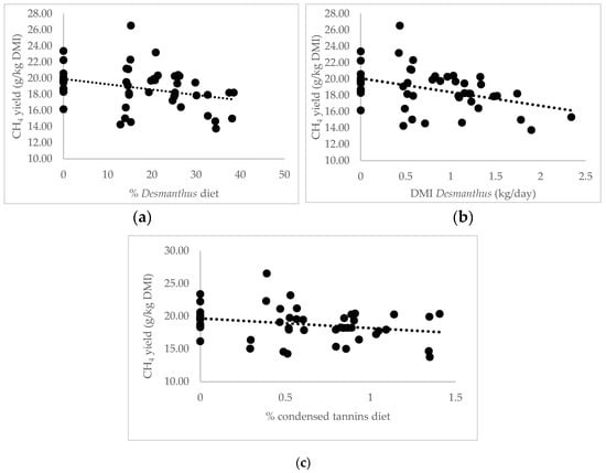 Relationship between CH4 yield (g/kg DMI) (y) and (a) percentage of Desmanthus in the diet (y = 19.92 − 0.066X, where X = percentage of Desmanthus in the diet, R2 = 0.20, p = 0.0097), (b) Desmanthus dry matter intake (kg/day) (y = 20.08 − 1.68X, where X = Desmanthus dry matter intake, R2 = 0.25, p = 0.00075), (c) percentage of condensed tannins in the diet (y = 19.67 − 1.49X, where X = percentage of condensed tannins in the diet, R2 = 0.15, p = 0.035).