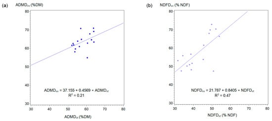 NDFDvv (% NDF) = 21.787 + 0.8405 × NDFDvt (% NDF) (R2 = 0.47; SE = 0.238; P = 0.003).