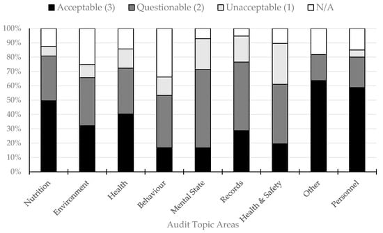 Our analysis of the WW Audit showed that, whilst it does not prioritize the promotion of positive experiences as its assessment criteria, it consistently questions a wide range of management practices pertaining to primary care that can have a direct and indirect impact on an animal’s welfare [23] and demonstrates clear common welfare concerns across the surveyed facilities. It was noted that there were a higher number of questions within the animal health topic area. Any bias towards questions pertaining to animal health may also be due to the pre-established “snap-shot” audit approach that relies on a range of physical health indicators in domestic species [51], including body condition scores, signs of disease or lameness [52], and the ease of assessment with more quantifiable data. Good basic health care, in terms of the five basic needs being met, is usually taken for granted within leading zoos and aquariums, and thus, more focus can be given to behavioural outcomes and developing understanding of animals’ affective states, but a lack of expertise means that within non-affiliate facilities, questioning animal health care activities must be a serious consideration.