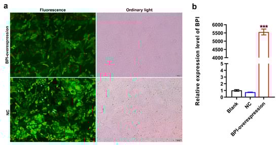 Next, we confirmed that we were able to successfully transduce PK15 cells with the pGLV5-BPI and pGLV5-NC lentiviral vectors, as confirmed based on the presence of detectable green fluorescent protein within these cells (Figure 2a). Subsequent qPCR analyses confirmed that cells transduced with the pGLV5-BPI plasmid exhibited significant BPI overexpression (5556-fold higher than in control cells; Figure 2b). These findings thus indicated that we had successfully prepared BPI-overexpressing PK15 cells, which were then used for a series of experiments.