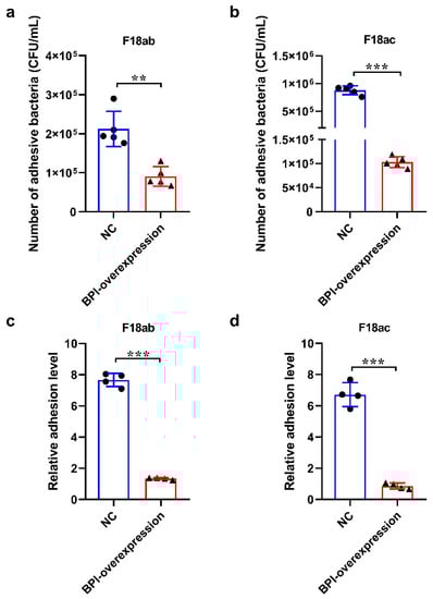 A colony counting assay revealed that the overexpression of BPI was sufficient to markedly suppress the adhesion of E. coli F18ab (Figure 3a) and E. coli F18ac (Figure 3b) to PK15 cells (p < 0.01 and p < 0.001, respectively). In line with this, qPCR analyses of PILIN gene confirmed that BPI overexpression significantly impaired E. coli F18ab (Figure 3c) and E. coli F18ac (Figure 3d) adhesion to these PK15 cells (p < 0.01 and p < 0.001, respectively). As such, these findings indicate that BPI overexpression can interfere with E. coli F18 adherence to PK15 cells.