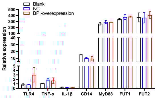 The impact of BPI overexpression on Toll-like receptor 4 (TLR4) signaling pathway-related gene expression and on α-(1,2) fucosyltransferase (FUT1, FUT2) gene expression. Blank: untreated control group, NC: PK15 cells transfected with the negative control lentivirus (pGLV5-NC), BPI-overexpression: PK15 cells transfected with the BPI gene overexpression lentivirus (pGLV5-BPI). Samples were analyzed in triplicate. Data are means ± standard deviation.