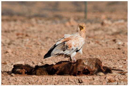 The Canarian Egyptian Vulture (Figure 1) is a medium-sized (2–3 kg) and long-lived territorial scavenger whose population strongly declined during the 20th century owing to the incidence of non-natural mortality, mainly accidents with power lines and indirect poisoning []. Currently, it survives only in the eastern islands with the bulk of the population concentrated in Fuerteventura. The species has deferred sexual maturity with an age of recruitment between 4 and 10 years in the Canarian population []. The breeding season lasts from early February to late June. Throughout the year, but especially during the non-breeding season, Egyptian Vultures congregate in large numbers at communal roosts located on power lines as well as at predictable feeding places such as the garbage dump, feeding stations, and large livestock farms (see [,] for details).