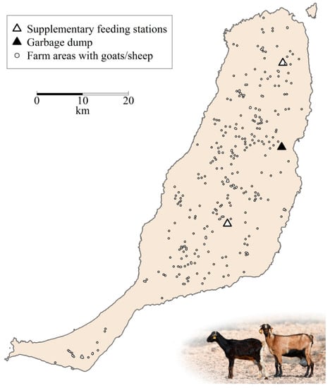 We gathered information on the geographical location and number of livestock (goats and sheep) from 318 farms on Fuerteventura between 2013 and 2016 (Figure 2). Data were obtained from both the Spanish Government [] and from unpublished information from regional and local Governments (Dirección General de Protección de la Naturaleza of the Canarian Government and Cabildo Insular de Fuerteventura). We completed this information with 122 personal phone calls to local farmers (each owning >100 goats or sheep) to obtain information (or get confirmation) about their locations and number of livestock. As a result, between 2013 and 2016, we knew the location and herd size of 280–306 farms holding 94–98% of the total livestock on the island. This figure varied between 85,000 and 102,000 heads, around 85% of them being goats and the remaining sheep.