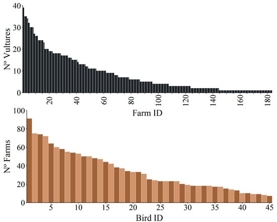 Frequency distribution of (top) the number of vultures that visited each farm (Farm ID) during the whole study period and (bottom) the number of farms that were visited by each tagged vulture (Bird ID) during the whole study period. There were 77 farms not visited by vultures that were not included in the figure.