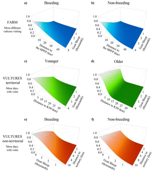 Effects of interacting variables in top-ranked models analyzing visits to farms by Egyptian Vultures. Effects of farm size (number of goats or sheep) on the probability of response variables: on top, FARM variable according to the distance to the nearest highly predictable feeding place (Dist HPFP) and season (a) breeding vs. (b) non-breeding, in the middle, VULTURE territorial variable regarding the distance to the nearest occupied territory (Dist Terr) and the (c) minimum (younger) or (d) maximum (older) age range; on the bottom, VULTURE non-territorial variable regarding the distance to the nearest core area of each individual (Dist K50) and season (e) breeding vs. (f) non-breeding. Values for explanatory variables in top-ranked models used in predictions are the mean of the range with some exceptions to clarify the effects: for VULTURE territorial, Area K95 is the minimum of the range, Dist Terr is the maximun, Sex is male, and Breeding is breeding season; for VULTURE non-territorial, Dist K50 is the minimum of the range.