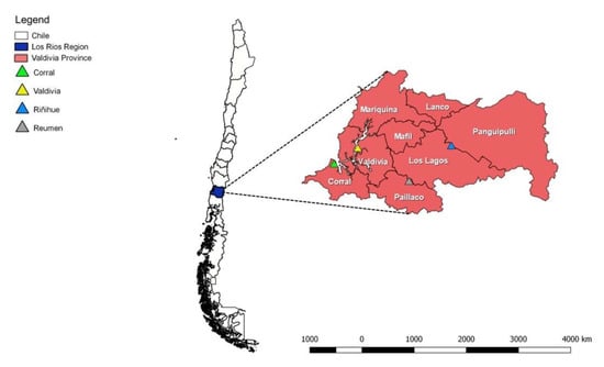 A cross-sectional study in which 121 rodent species were trapped on 11 dairy farms in the Los Ríos Region, Southern Chile, was designed. Most of these farms did not apply any systematic control with rodenticides. Capturing was conducted within Valdivia Province, Southern Chile, and included the rural communities around the city of Valdivia (39° 47′ 21.48″ S 73° 14′ 37.32″ W), Reumen (39° 59′ 54.96″ S 72° 49′ 18.12″ W), and Riñihue (39° 46′ 25.32″ S 72° 28′ 20.28″ W) (Figure 1).