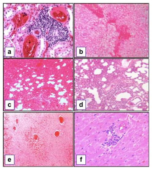 Lastly, 26.1% of the heart samples showed lesions consistent with the infection, mainly in the form of multifocal, mononuclear inflammation and hemorrhages in the myocardium (Figure 2f).