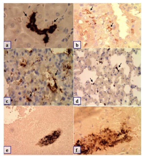 Indirect immunostaining (Anti-LipL32) of pathogenic Leptospira spp. Brown-stained aggregates of filamentous bacteria consistent with Leptospira (pointed out with arrows) in different tissues. (a,b) Tubular lumen and between cells of the tubular epithelium in the kidney (100×); (c,d) lung tissue (10×); (e) liver tissue (10×); (f) heart tissue (100×).