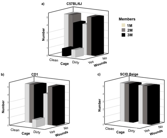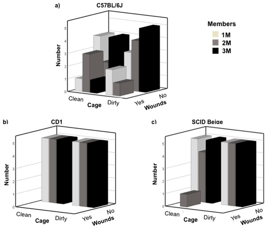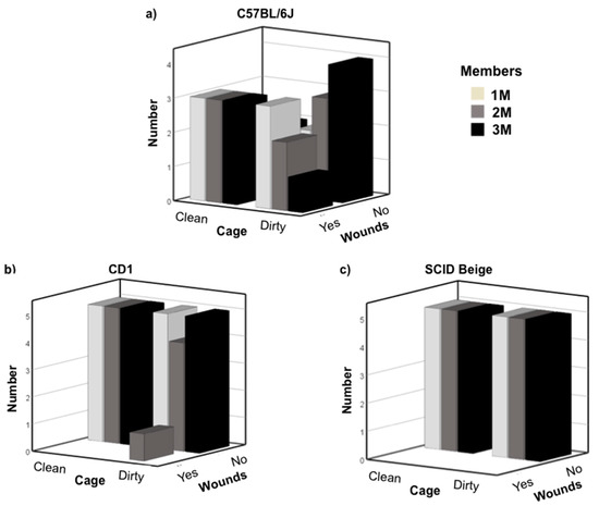 Finally, we grouped newly weaned males with late pubescent males. The average age of late pubertal stage males was 44.6 ± 0.32 days for C57BL/6J, 44.45 ± 0.37 for CD1, and 44.06 ± 0.36 for SCID Beige mice. Chi-square test of independence showed that there was a significant and relatively strong association between strain and wounds due to fights—X2 (2, N = 90) = 32.078, p = 0.000; Cramer’s V = 0.597. No association was observed between cleaning and the number of hosting group members with wounds due to fights. C57BL/6J mice showed more agonistic behaviors than the other strains. We found four weaned animals dead the morning after they were grouped (one in each of the following conditions—1M clean cage and 1M, 2M, and 3M dirty cages) and one with severe wounds due to fights that had to be sacrificed that was grouped in a 1M dirty cage. In addition, the day after grouping we observed moderate wounds due to fights in two 1M, two 2M, and three 3M clean cages and one in each of 1M, 2M, and 3M dirty cage conditions. These ten newly weaned mice had to be singly housed. In total, 50% (15/30) of the studied cages in the C57BL/6J strain presented wounds due to fights that were classified as moderate or severe. Four experimental conditions (1M, 2M, and 3M clean cage and 1M dirty cage) reached the maximum of three cages to conclude that under these conditions newly weaned males could not be grouped (Figure 3a). Regarding CD1 mice, we observed moderate wounds due to fights in a newly weaned mouse (1/30; 3.3%) grouped in a 2M dirty cage the day after grouping and singly housed (Figure 3b), but we did not observe any fights in SCID Beige mice (Figure 3c).