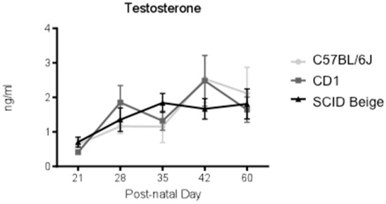 C57BL/6J, CD1, and SCID Beige testosterone plasma level (ng/mL) at different postnatal days. Data are expressed as mean ± SEM. We analyzed 10 animals per strain and age.