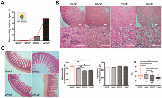 The mortality due to gout occurred mostly at the age of 10–15 days. We found a dose-dependent relationship between the morbidity of gosling gout and dietary protein levels (Figure 1a). The morbidity in the 220CP group was 37.5%, which was considerably higher than that in the other diet groups, whereas that in the 200CP group was 7.7%. The kidneys from the dead goslings exhibited predominant gross lesions, that were pale, mottled, and swollen. The renal tubules and ureters were distended with excessive urates. Histology showed that the damage to the kidneys became severe with an increase in the dietary protein level on day 15 (Figure 1b). In particular, the morphology revealed that the renal tubular epithelial cells exhibited severe hydropic degeneration in the 220CP group.