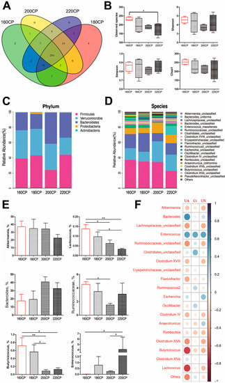 The degrees of gut dysbiosis in cecum of goslings with different protein diets. (A) Venn diagram of the observed species; (B) total observed species and alpha diversity indexes, n = 6; (C,D) microbiome composition at the phylum and species levels, n = 6; (E) the average abundances of some genera among groups, n = 6; (F) correlation analysis between the abundant genera and the serum concentration of UA, Cr, and BUN in goslings with different protein diets by the R program. The circle size and color intensity represent the magnitude of correlation. Blue circle = positive correlation; red circle = negative correlation. UA: uric acid, Cr: creatinine, BUN: blood urea nitrogen. Asterisks represent differences between groups being significant (* P < 0.05, ** P < 0.01).