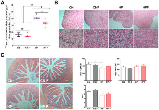 Evaluation of changes in renal injury and intestinal morphology in goslings among groups (groups: CN: a basal diet; CNF: replaced 5.0% basal diet with fermented feed; HP: a high-protein diet; HPF: replaced 5.0% high-protein diet with fermented feed). (A) The morbidity of gout in goslings among groups; (B) morphological observation of the kidney by HE stain (Bar = 100 μm). (C) Morphological observation and of the intestinal villus among groups (HE staining, Bar = 200 μm); (D) the comparisons of villus height, crypt depth, and their ratio in cecum. CN: 162.9 g/kg CP, a basal diet; CNF: 167.5 g/kg CP, replacing 5.0% basal diet with fermented feed; HP: 229.7 g/kg CP, a high-protein diet; HPF: 230.7 g/kg CP, replacing 5.0% high-protein diet with fermented feed. Asterisks represent differences between groups being significant (* P < 0.05, ** P < 0.01).